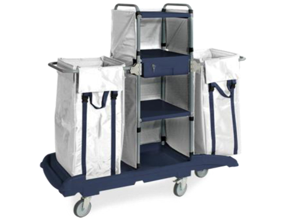 Base en plastique dur sur 4 roues Ø 125 (2 avec frein). Structure en acier revêtement rilsan, 3 étagères, 1 tiroir avec serrure, 2 sac nylon 150 lts. Dimensions chariot: 140x55x152 h / 24 Kg